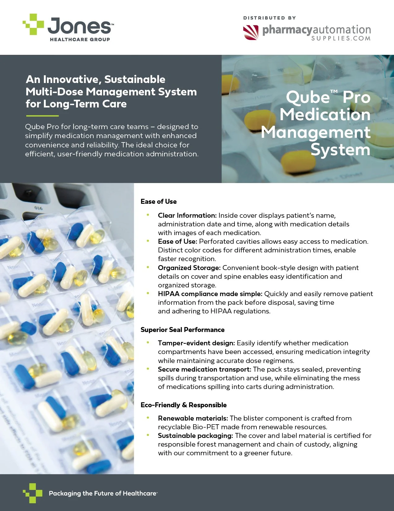 Qube Pro uses sustainability features to reduce material use and packaging waste without compromising medication protection or performance in care LTC settings.